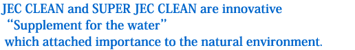 We conquered two problems of gDefusing the heavy metal ion, etc.h and gPreventing re-elution of toxic substance from treated waterh that have been the most difficult to solve. JEC CLEAN and SUPER JEC CLEAN were developed by our newest technology and system, correspond to every polluted water. It is not only low cost but also it is an innovative and environmentally friendly gSupplement for the waterh.